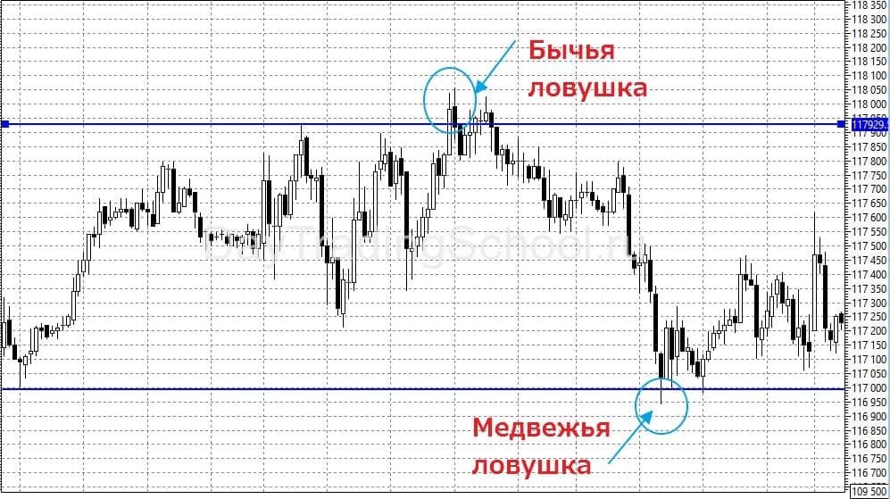 Бычья и медвежья ловушки, если можно так сказать, это ловушки для опытных трейдеров. В данном случае трейдер дожидается полагающегося закрепления выше/ниже уровня и работает в сторону пробития, но рынок начинает двигаться в противоположную сторону и очень часто предшествует этому какая ни будь фигура из свечного анализа или price action.