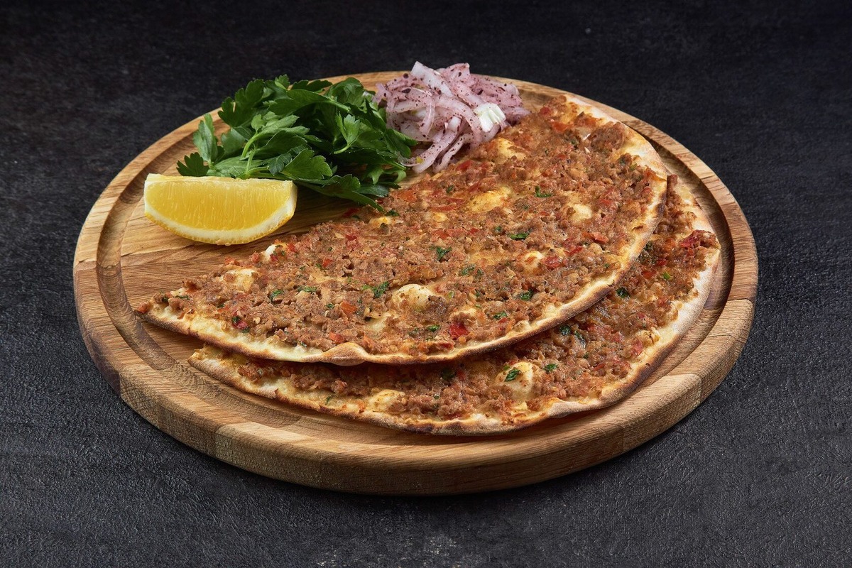 Это очень популярное закусочное блюдо турецкое, арабское и армянское . Вариант пиццы. Давайте приготовим. Ингредиенты для теста: -0.5 стакана теплой воды; - 2 стакана муки; - 0.5 ч.ложки соли; - 0.5 ч.ложки сахара. Ингредиенты для начинки: - мясо говядины 200 гр.(фарш); - 1 луковица; - 2 шт. перца красного / зелёного ; - 2 зубчика чеснока; - пучок петрушки свежей; - 1 шт. помидор ; - 1 ст.ложка томатной пасты; - 1 ч. ложка паприки; - 1 ч. ложка черного молотого перца; - 1 ч.ложка молотого тмина; - 1 ч. ложка соли. Ингредиенты для заправки лахмаджуна: - 1 шт. лука; - листья салата зелёного; - помидор; - гранатовый соус (наршараб); - лимон. Давайте приготовим. Пошаговая инструкция: 1) Приготовим начинку . Возьмём мясо или готовый фарш говяжий .Я делаю фарш сама. Если мясо с жирком очень хорошо, будет сочное. Если мякоть мяса без жира, то для вкуса и сочности можно добавить немного сливочного масла в фарш. Фарша должно быть немного ,чуть меньше ладошки. Дело в том, что начинку распред