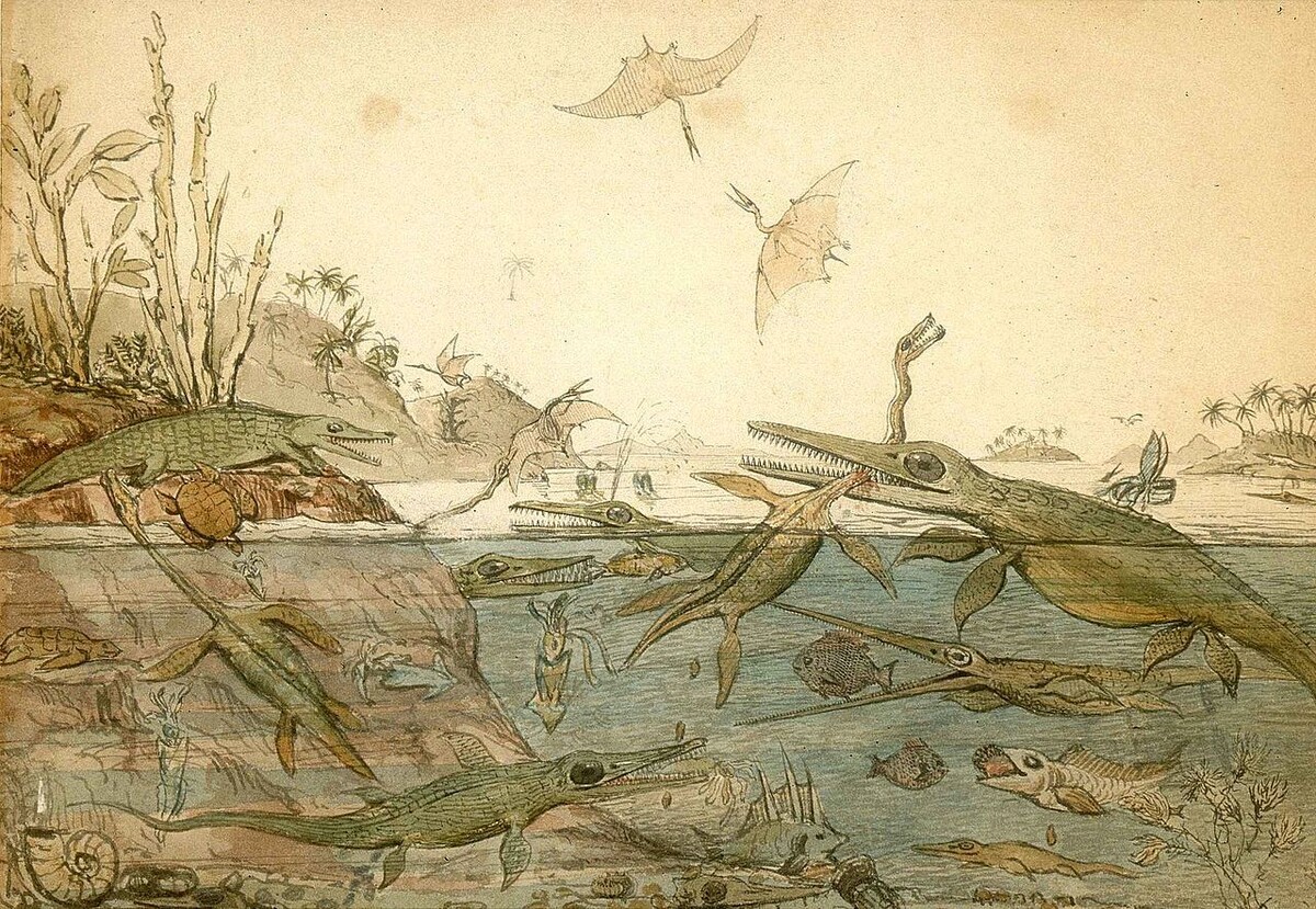 Палеонтология никогда бы не стала такой известной среди простых людей без палеоарта. Ведь он во многом способствовал популяризации этих потрясающих животных. Однако, палеоарт развивался вместе с палеонтологией. Отследим его историю от зарождения до наших дней. Всё началось примерно в 19 веке, когда палеонтология постепенно выделялась в отдельную науку. В 1830 году британский геолог друг детства палеонтолога Мэри Эннинг Генри Де Ла Беш, находясь под впечатлением от её открытий, написал картину “Duria Antiquor”, что в переводе с латыни означает “древний Дорсет” (графство в Великобритании). Британское общество было впечатленно. Сказать, что в изображении морских ящеров на ней было много научной неправдоподобности, ничего не сказать. Впрочем, тогда это было последнее слово науки. Фактически в это время и зародился палеоарт, как более менее оформленный вид искусства. В целом в 19 веке на картинах и гравюрах динозавры изображались как большие, но тупые и неповоротливые создания, котор
