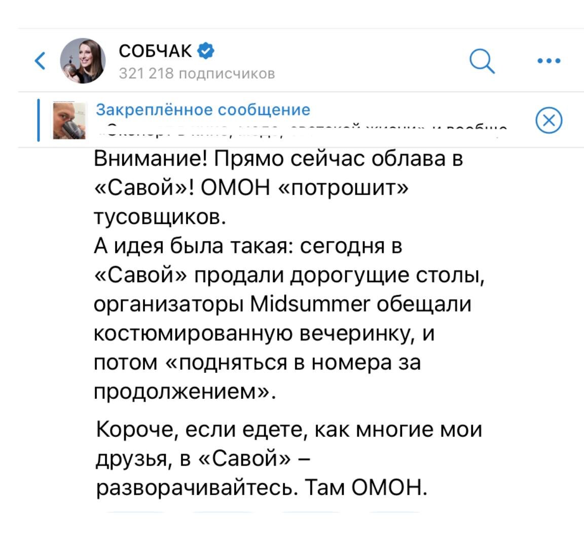 «Удивительно, как после «голой вечеринки» ещё остались и организаторы, и собственно тусовщики, которые, видимо, НЕ ВСЁ ПОНЯЛИ», — поразилась опытная Ксюша Собчак, предупреждая подписчиков не ехать в «Савой» из-за присутствия ОМОНа.