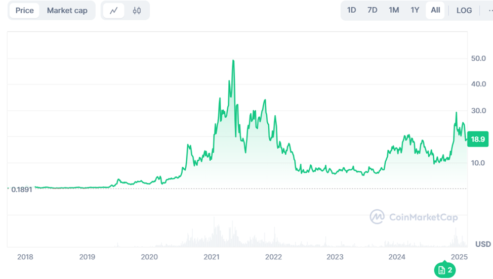На пике стоимость монеты достигала 50$, и первые пики были связаны с ростом активности DeFi – активно создавались различные протоколы, где можно было получать доходность, брать кредиты и выстраивать различные финансовые пирамиды. Сейчас в эту сферу заходят огромные средства из традиционных финансов. Создаются отдельные блокчейны под данное направление, где основную роль играют «псевдостейблы» - монеты, условно привязанные к доллару, но генерирующие дополнительную доходность, так как обеспечение привязано к облигациям или другим активам с фиксированным доходом. Вся эта сфера требует постоянного потока данных о биржевых котировках, и должно вызвать повышенный спрос на услуги оракулов, а значит, и на стоимость монеты.