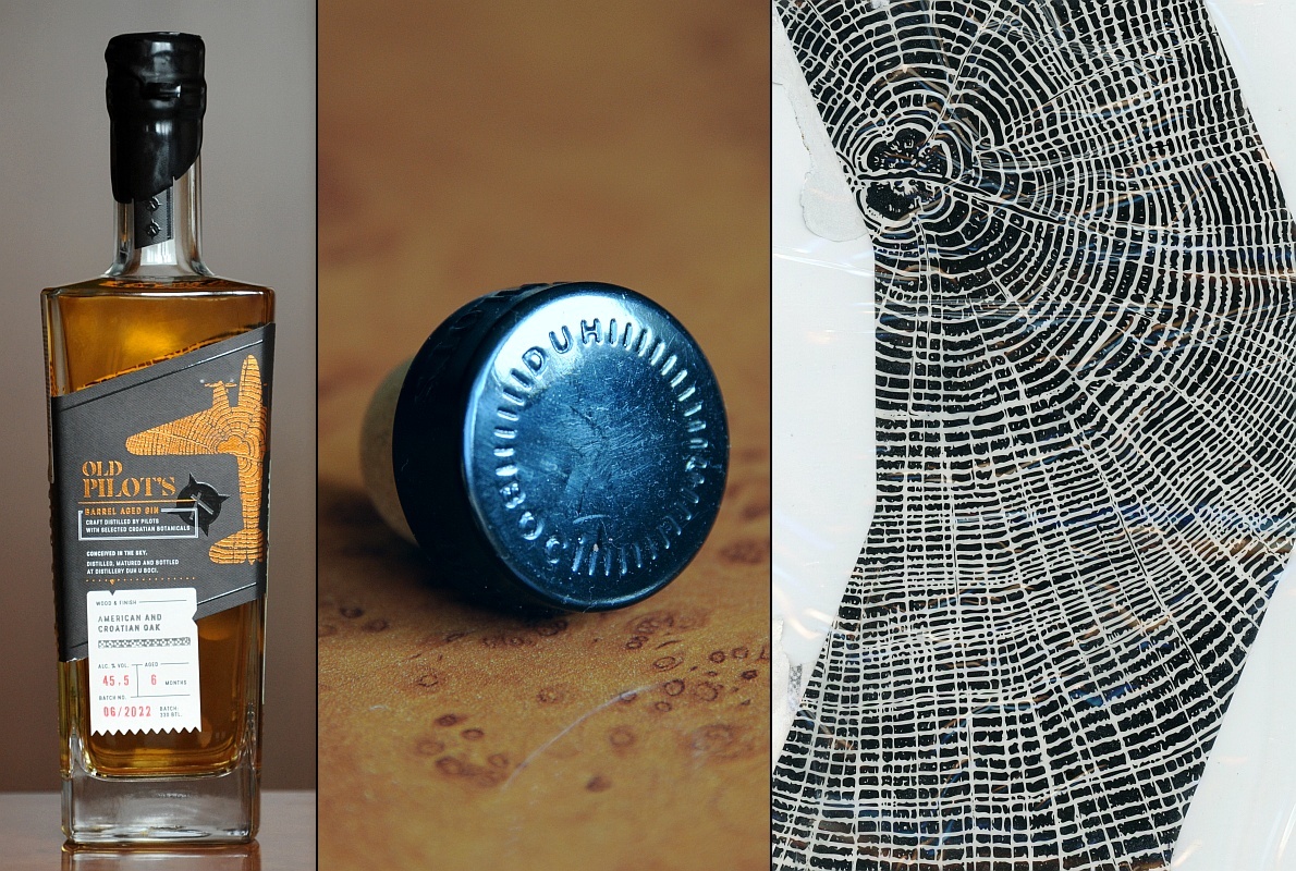 Продолжаем знакомиться с джинами. Обзор от моего друга El_gorra (текст и фото автора, ссылка на оригинал в конце обзора). Duh U Boci Old Pilot`s Barrel Aged Gin. Второй подход к представителю "авиационноых" джинов из Хорватии, в данном случае – более статусный и дорогой вариант с бочковой выдержкой в течение 6 месяцев (в американском и хорватском дубе). Оформление похожее, но ради подчёркивания "задубленности" напитка основательно выделен коричневый цвет разных оттенков в оформлении. Ну, собственно, и сам дистиллят тоже имеет откровенно коричневатый отлив. Пластиковая капсула, имитирующая сургуч – чёрная, в отличие от белого у базового джина. Чуть повышенный градус – 45,5%. Бочка номер 06/2022 (330 всего бутылок из этой бочки). Примечательно, что оборотная сторона главной этикетки имитирует дубовый срез с многочисленными годовыми кольцами (см. картинку). Странно, но русская контра настаивает на только 3-х месяцах дубовой выдержки (правда, упоминается довыдержка в бочках из-