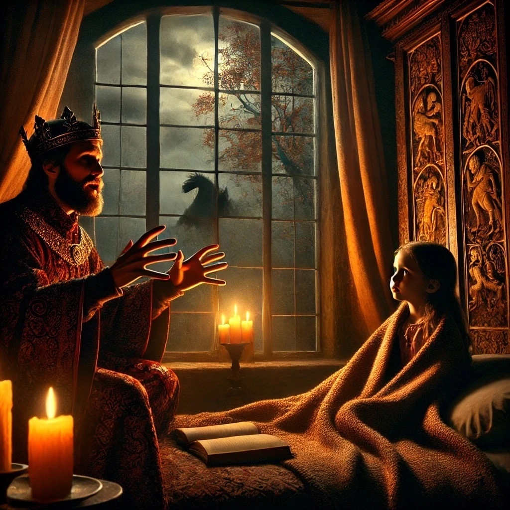 Его королевский плащ, бордовый, расшитый золотыми узорами, казалось, жил собственной жизнью, мерцая при каждом движении. Корона из чистого золота венчала его голову, а драгоценные камни, украшавшие её, словно хранили в себе отблески древних битв и былых побед. Но за этой грозной оболочкой скрывалось сердце, полное любви — любви к своей дочери, маленькой принцессе Диане.