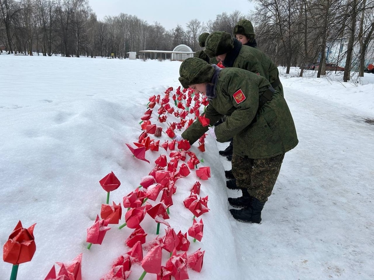 Сотни красных тюльпанов, накануне изготовленные школьниками Отрадного, символично алеют вокруг мемориального комплекса. Всероссийская акция - знак уважения и признательности к соотечественникам, проявившим самоотверженность и преданность Родине в боях за её пределами.