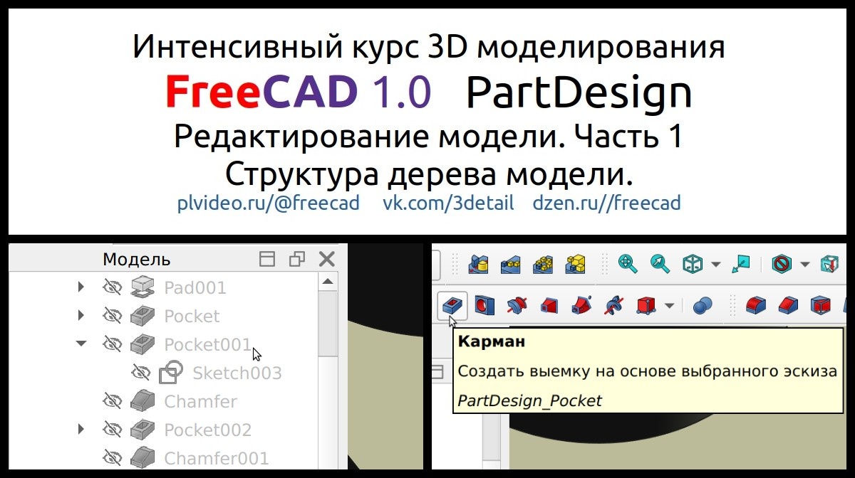 ЭТА СИНЯЯ ССЫЛКА создана исключительно для поддержки автора канала. Кому не лень, ПОЖАЛУЙСТА один раз КЛИКНИТЕ по ней. За ней нет ничего страшного. Если вам там не интересно - сразу уходите назад. Вам один лишний клик, а автору приятно. Здравствуйте. Наконец-то руки дошли и до PartDesign и что бы не мелочиться сразу начал с редактирования модели. Само моделирование особых трудностей не вызывает почти ни у кого, а вот редактирование готовой 3D модели для начинающих - это уже нечто. Предлагаю ознакомиться с первой частью видео о редактировании модели построенной в FreeCAD 1.0 в верстаке Part Design.