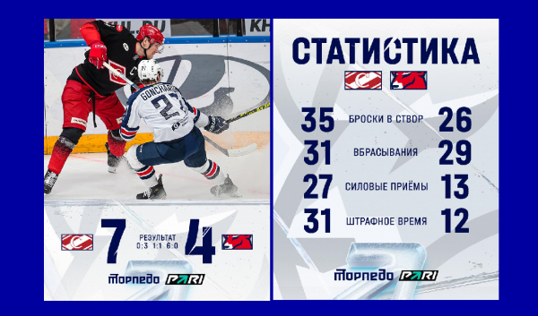 Нижегородское "Торпедо" прервало победную серию. Гостевой матч со "Спартаком" завершился со счетом 7:4 в пользу хозяев площадки. Нижегородцы сначала вели в счете и смогли забросить четыре шайбы, но в третьем периоде москвичи смогли переломить ход игры. ХК "Торпедо" просит поддержки у своих болельщиков: "Обидно? Да. Но унывать точно не стоит! 💪 Впереди домашние матчи, где нужна максимальная поддержка трибун! Ждем всех, двигаемся дальше вместе!" Фото: ХК "Торпедо".
