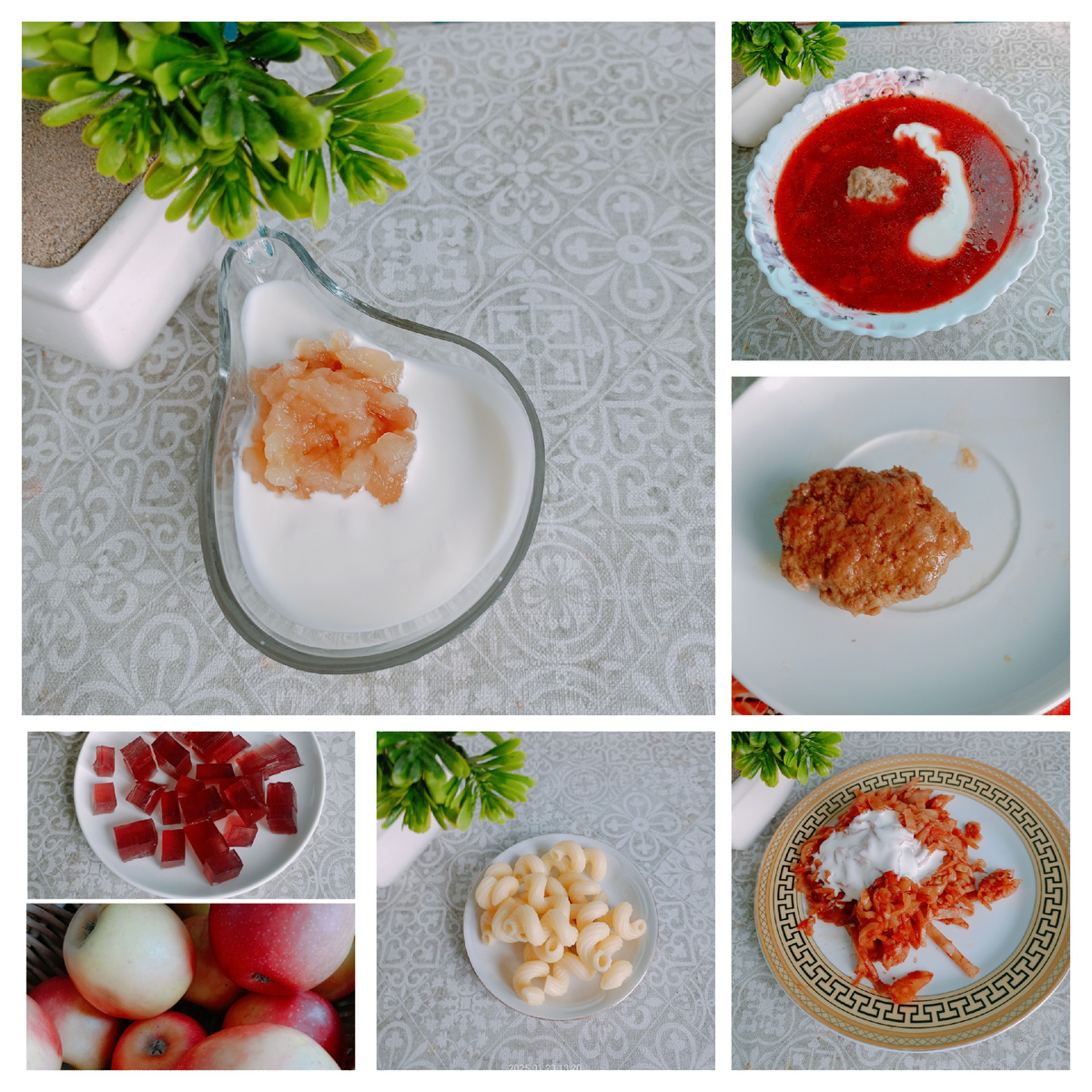 Обед - тушёная капуста с мацони и макароны вместо хлеба; на десерт мацони с яблочным повидлом.