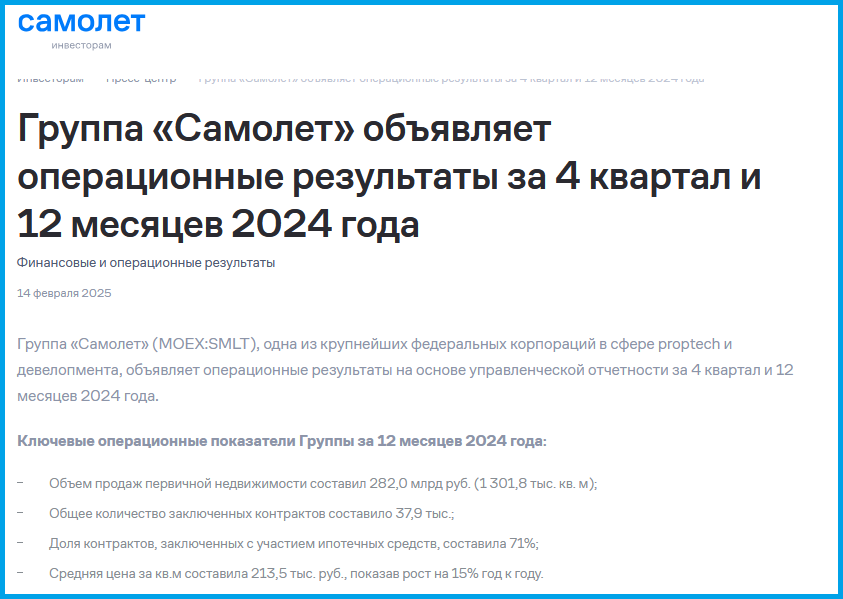 Недавно ГК Самолет показала операционный отчет за 2024 год. Это конечно не МСФО, но хоть что-то. Предлагаю взглянуть на отчет и проанализировать цифры.