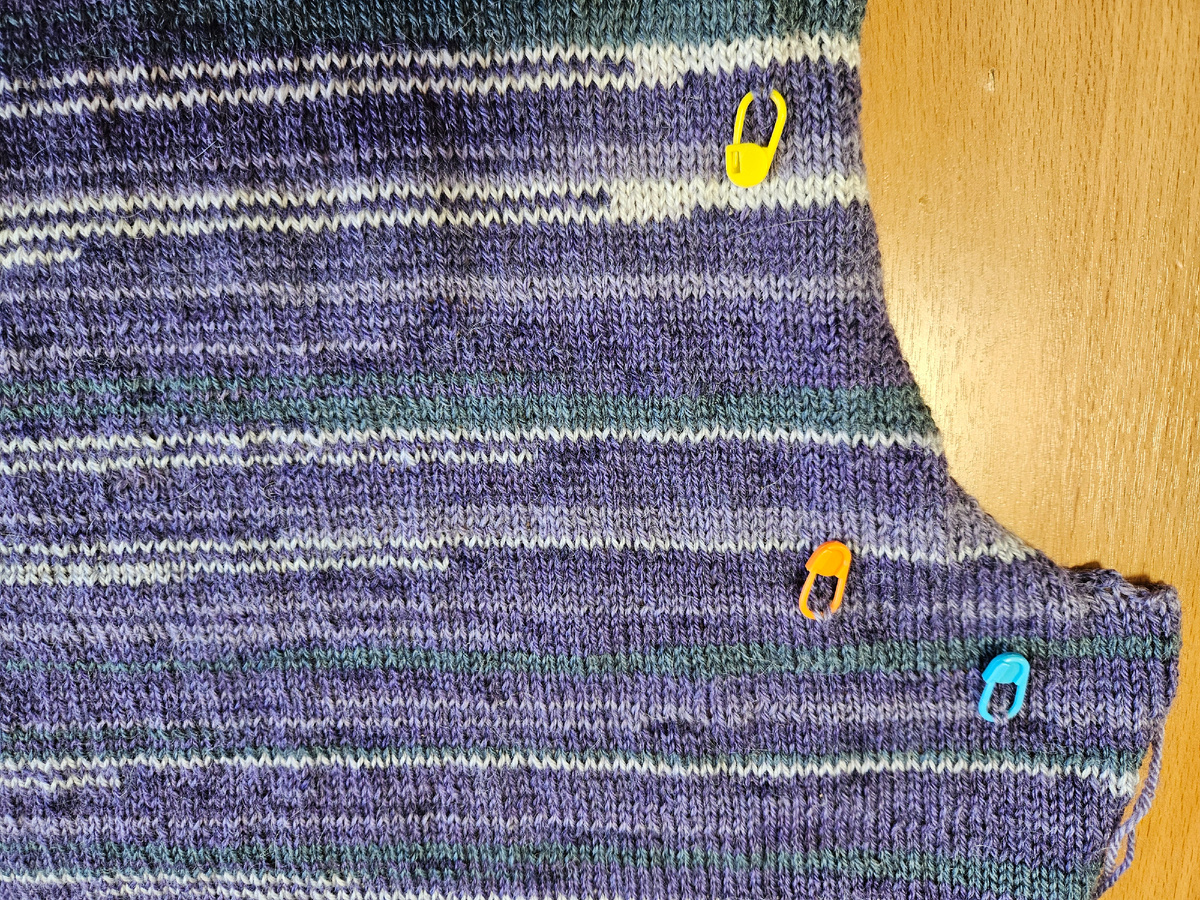 Провязав 70 рядов лицевой гладью, начинаем вывязывать пройму. 1 ряд (лицевой): 4 петли закрыть, лицевые, 1 кромочная. 2 ряд (изнаночный): 4 петли закрыть, изнаночные, 1 кромочная. 3 ряд (лиц): 3п. закрыть, лицевые, 1 кром. 4 ряд (изн): 3п. закрыть, изнаночные, 1 кром. 5 ряд (лиц): 1 кром, лицевые, 1 кром. 6 ряд (изн): 1 кром, изнаночные, 1 кром. 7 ряд (лиц): 2п закрыть, лицевые, 1 кром. 8 ряд (изн): 2п закрыть, изнаночные, 1 кром. 9-12 ряд: лицевая гладь 13 ряд (лиц): 1п закрыть, лицевые, 1 кром. 14 ряд (изн): 1п закрыть, изнаночные, 1 кром. 16-20 ряды лицевая гладь. 21 ряд (лиц): 1 закрыть, лицевые, 1 кром. 22 ряд (изн): 1 закрыть, изнаночные, 1 кром. 23-30 ряд лицевая гладь. 31 ряд (лиц): 1 закрыть, лицевые, 1 кром. 32 ряд (изн): 1 закрыть, изнаночные, 1 кром. 33-42 ряд лицевая гладь. 43 ряд (лиц): 1 закрыть, лицевые, 1 кром. 44 ряд (изн): 1 закрыть, изнаночные, 1 кром. 45-70 ряды лицевая гладь. Продолжение следует!