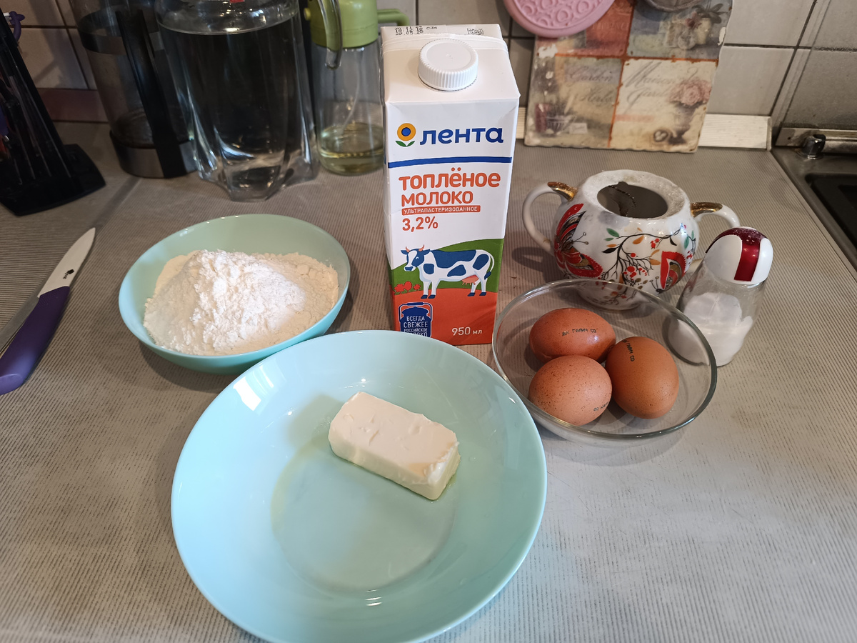 Как видите, практически, стандартный набор продуктов. Вот только в обычные блины добавляем растительное масло, а в данном случае сливочное.