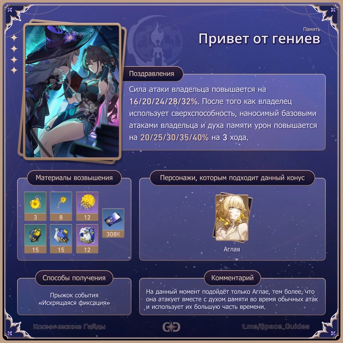 ㅤВ версии 3.0 стал доступен новый игровой Путь — Память, который ранее встречался только в контексте сюжета и Виртуальной Вселенной. А для нового Пути предполагаются и новые конусы, в том числе и «Привет от гениев». ㅤЭтот конус доступен в течение второй половины версии обновления, а после окончания баннера он станет доступен в любом баннере, кроме баннера новичка. С тем, что он из себя представляет, можно ознакомиться в статье! ㅤС подробным описанием пассивного таланта и материалами, которые нужны для прокачки конуса, можно ознакомиться на изображении: ㅤПовышает силу атаки владельца на 16/20/24/28/32%, а после использования его сверхспособности, повышается урон обычных атак носителя и духа памяти на 20/25/30/35/40% на 3 хода. ㅤСветовой конус можно получить в течение баннеров второй половины обновления, вместе с сигнатурными конусами Аглаи, Серебряного Волка, Бутхилла и Зарянки. После окончания баннера, конус доступен в любом Прыжке, в том числе и в стандартном. В будущем, во время неко