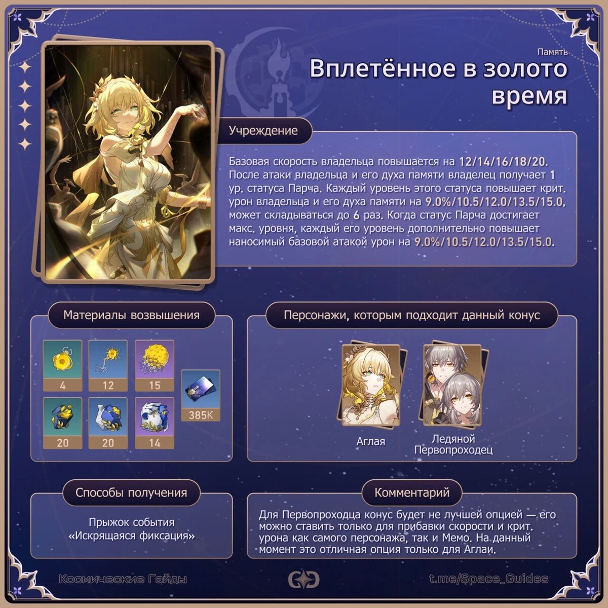 ㅤ«Вплетённое в золото время» — сигнатурный Световой конус Аглаи, первого легендарного персонажа нового Пути. Сам по себе конус обладает неплохими характеристиками и является незаменимым для самой Аглаи. Но стоит ли он своих круток? ㅤ«Вплетённое в золото время» — сигнатурный Световой конус Аглаи. ㅤС подробным описанием пассивного таланта и необходимыми материалами можно ознакомиться на картинке: ㅤПовышает базовую скорость на 12/14/16/18/20. Каждая атака и его духа памяти даёт 1 ур. статуса Парчи, который повышает крит. урон носителя и духа памяти на 9/10.5/12/13.5/15% за каждый стак (складывается до 6 раз). По достижению максимального уровня Парчи, каждый его уровень дополнительно повышает урон, наносимый базовой атакой, на 9/10.5/12/13.5/15%. ㅤВажно! Конус повышает именно базовую атаку владельца (т. е. серые цифры). Это может иметь влияние, если персонаж стакает свои навыки от базовых характеристик, но на данный момент это редкость. ㅤСветовой конус «Вплетённое в золото время» доступен