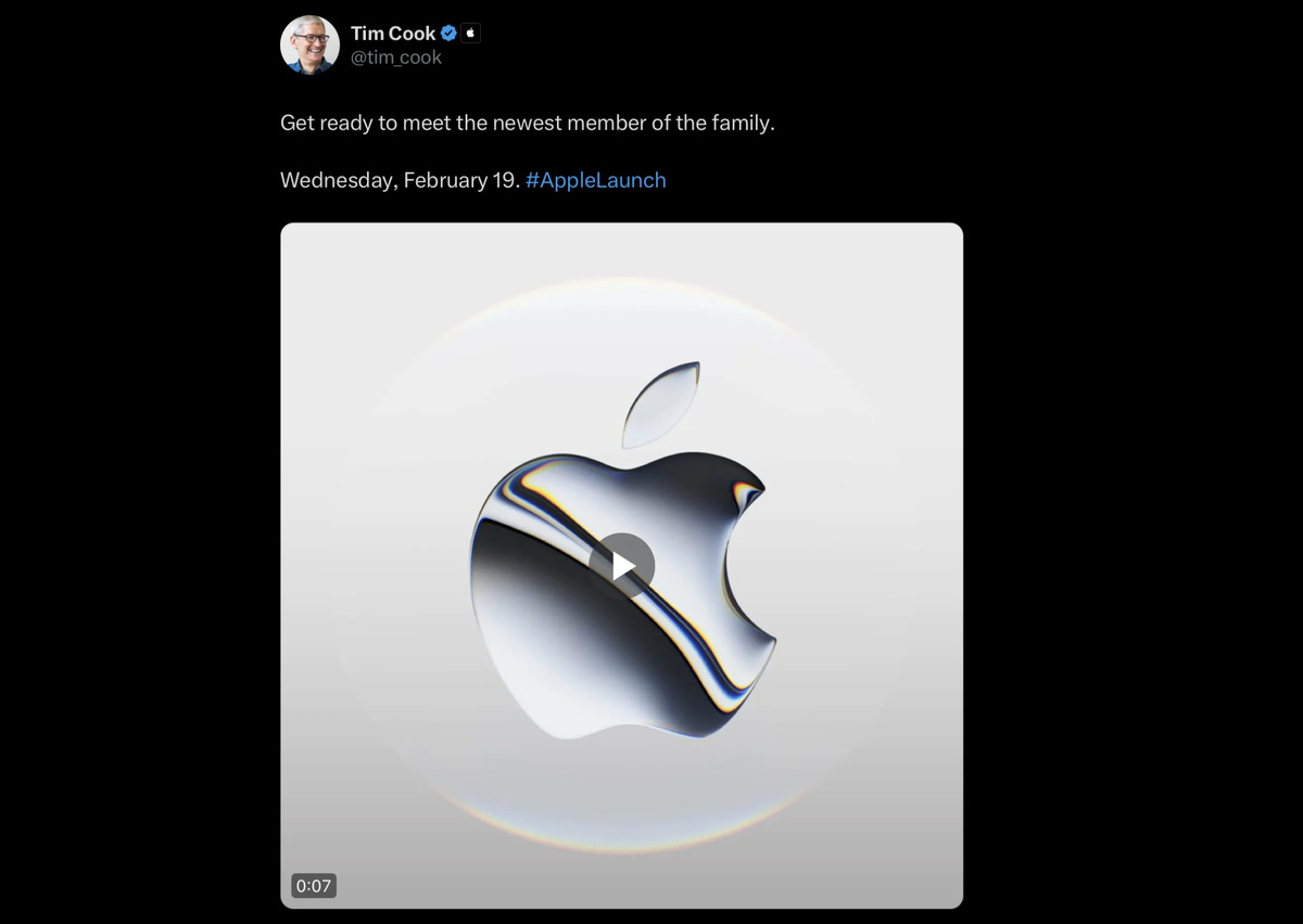 Кук написал, что презентация нового устройства состоится в среду на следующей неделе, 19 февраля. Конкретных подробностей нет, но Кук выложил короткий видеоролик с логотипом Apple серебристого цвета и следующими словами: «Приготовьтесь к встрече с новым членом семьи. Среда, 19 февраля».