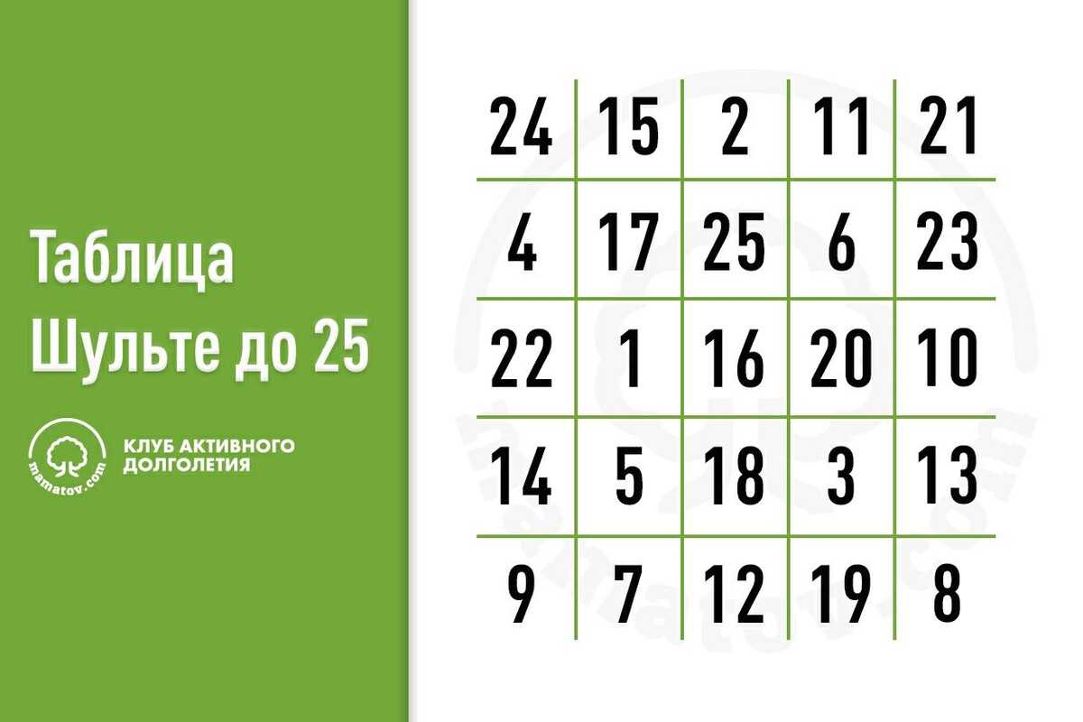 Друзья, сегодня предлагаю вам немного поиграть, а заодно: 💡 потренировать и омолодить мозг, 💡 провести диагностику поисковых навыков, 💡 улучшить внимание и память, 💡 развить образное мышление, 💡 потренировать периферическое зрение. В этом деле поможет таблица Шульте — отличный инструмент для прокачки когнитивных способностей. Обратите внимание на картинку. Вам необходимо поочерёдно найти в таблице все цифры от 1 до 25, пройдя весь путь глазами. ⏰ Перед тем, как начать тренировку, поставьте таймер. Так вы поймёте за сколько времени вы выполнили этот квест. Средняя норма для взрослого человека — 40-50 сек. Важно❗Цифры вслух произносить НЕЛЬЗЯ. Нужно работать ТОЛЬКО глазами. Друзья, таблица Шульте «приносит плоды» не только при верном выполнении, но и систематическом подходе. Проведите хотя бы 15-30-дневный курс занятий, уделяя им по 20-30 минут 3-4 раза в неделю. Если во время тренировки вы почувствуете неприятные ощущения, сделайте перерыв или проведите её на следующий день. ☝ Реко