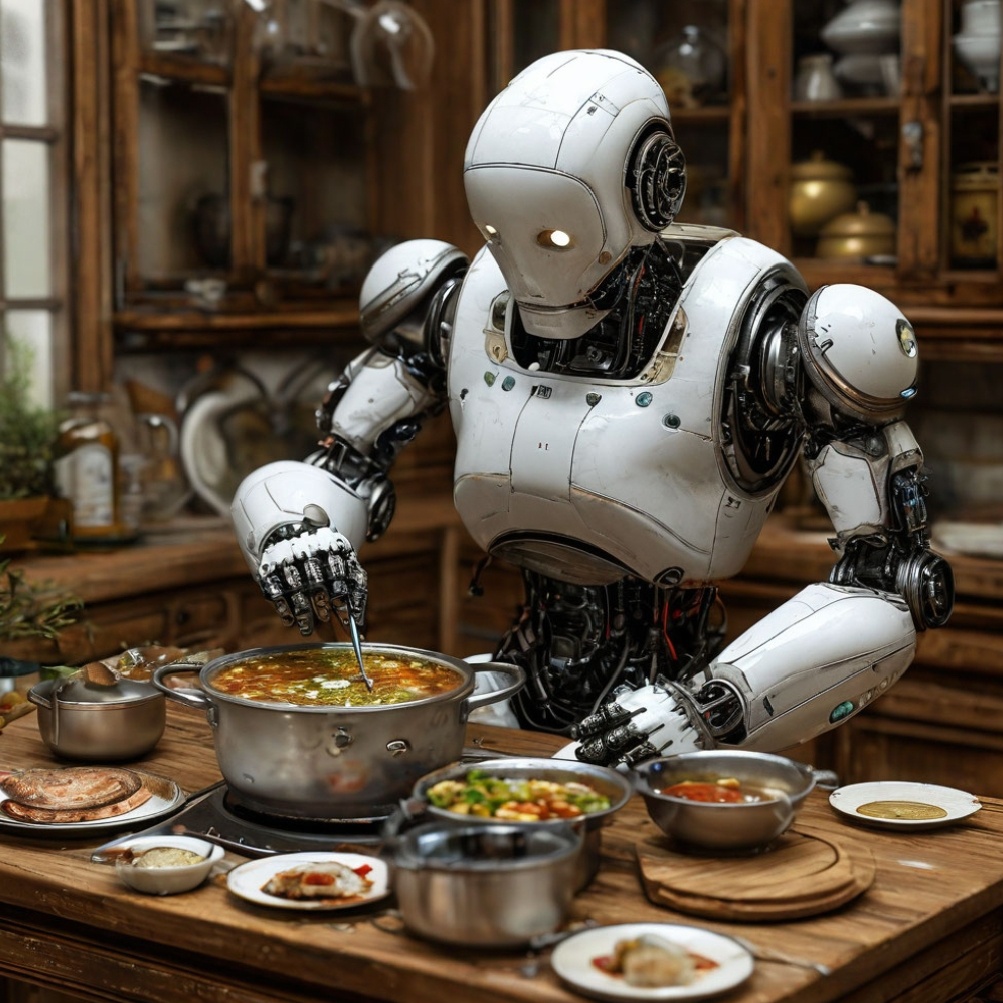 Семья Ивановых собралась за ужином. Это была необычная семья: папа — бывший программист, мама — философ, их сын-подросток — блогер, а бабушка — единственная, кто читала бумажные книги. Возле них стоял "умный" сервировочный (впрочем, он был универсальным) робот, который не только подавал блюда, но и анализировал настроение каждого члена семьи, чтобы предложить идеальную тему для разговора.