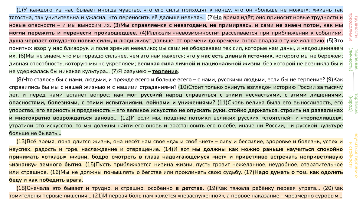Далее И.А. Ильин рассуждает о судьбе русского народа, полной несчастий, лишений, опасностей, болезней, войн и унижений. Целая нация смогла справиться с вековой чередой испытаний, так как обладала «великим искусством не опускать руки, стойко держаться, строить на развалинах и многократно возрождаться заново». Мы, потомки великих русских «терпеливцев», должны воспитывать в себе это качество, чтобы сохранить родную культуру. Можно сделать следующий вывод: терпение является чертой народного характера, именно это качество помогло нации пережить трудные времена.