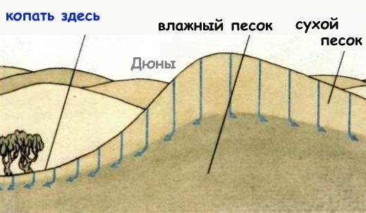 Здравствуйте. Перед этим читайте статью по этой ссылке: https://dzen.ru/a/Z6hq0a9OBAN4dVCQ В пустыне жизненно важно найти воду. Будьте наблюдательны. Помните, что вода образует в земле углубления, овраги, вымоины. Где есть вода – есть растительность. Поэтому ищите - заросли травы. - низины, рвы и высохшие русла рек. - следите за передвижением животных и птиц. - увидев облака, дожди, идите в том направлении. - обойдите подножья скал. - помните, что вода может скрываться под землёй. Отыщите высохшее озеро, копайте в самом низком месте. Когда песок станет влажным перестаньте копать, дайте воде скопиться в яме. - во время дождя старайтесь набрать воду во все имеющиеся сосуды, как можно больше. Избегайте обезвоживания. Для этого максимально прикрывайте тело, чтобы пот меньше испарялся. Пейте воду не спеша, маленькими глотками. Есть смысл сделать солнечные испарители. Если имеется кусок полиэтилена. Для начала нужно выкопать круглую яму метровой глубины. Посередине дна нужно выкопать ещё одн