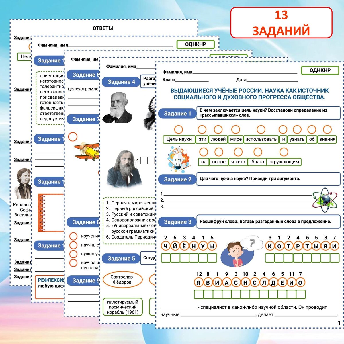Рабочий лист «Выдающиеся учёные России. Наука как источник социального и духовного прогресса общества» разработан к уроку ОДНКНР для учеников 6 класса. Лист разработан в соответствии с Федеральной образовательной программой. Рабочий лист можно использовать как отдельно, так и в комплекте с презентацией, ссылка на которую дана ниже. Рабочий лист состоит из 13 заданий, рефлексии и двух страниц с ответами. Задание 1. В чем заключается цель науки? Восстанови определение из «рассыпавшихся» слов. Задание 2. Для чего нужна наука? Приведи три аргумента. Задание 3. Расшифруй слова. Вставь разгаданные слова в предложение. Задание 4. Разгадай кроссворд. В клетки кроссворда впиши фамилии учёных. Подпиши портреты.