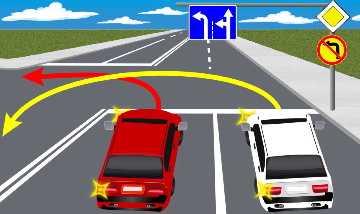 Доброго времени суток! Сегодня задача по ПДД, которая может запутать даже опытных водителей. В этой задаче, нам нужно выяснить, кто из водителей нарушит ПДД, поехав в направлении стрелки. Ответ 1, ни один из водителей не нарушит. Ответ 2, только водитель красного авто. Ответ 3, только водитель белого авто. Ответ 4, оба водителя нарушают. Друзья, а теперь напишите свои варианты ответа в коментарии. Надеюсь, все ответили правильно, а мы переходим к разбору задачи. На смоделированной картинке мы видим два легковых автомобиля, которые подъехали к перекрестку с одного направления. На этом перекрестке водитель красного авто планирует повернуть налево, а водитель белого автомобиля выполнить разворот. Чтобы дать правильный ответ, нам нужно более детально разобрать картинку с заданием, для начала начнем с дорожных знаков. На нашей картинке мы наблюдаем всего три дорожных знака, это знак главная дорога под ним знак 3.18.2, поворот налево запрещен Он на желтом фоне, а значит относится к