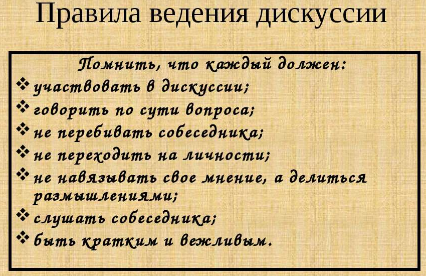 - Дискуссия от ругани отличается взаимным уважением и аргументированностью. Отказ от аргументации низводит дискуссию на уровень ругани. А переход на личности и отсутствие уважения низводит дискуссию на уровень базарной склоки. Дискуссия может быть очень жаркой, но оставаться дискуссией. И не обязательно стороны достигнут консенсуса, не так редко каждый остается при своем мнении. Дискуссия это поиск истины, а не перебранка.