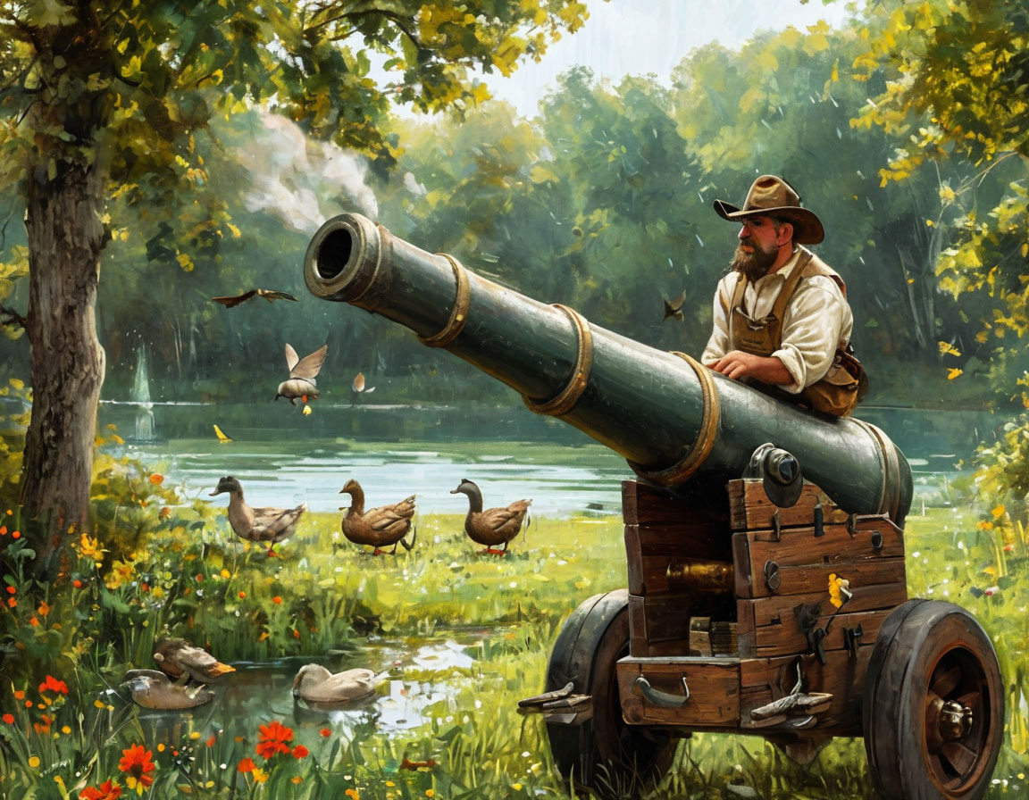 Когда пришло время стрельб, ситуация вышла из-под контроля. Как только первая пушка выстрелила, все утки (домашние и дикие) поднялись в воздух и начали кружить над головами солдат. Артиллеристы, стараясь не попасть по случайным "участникам", стали хаотично переносить свои позиции, создавая настоящую панику на полигоне.