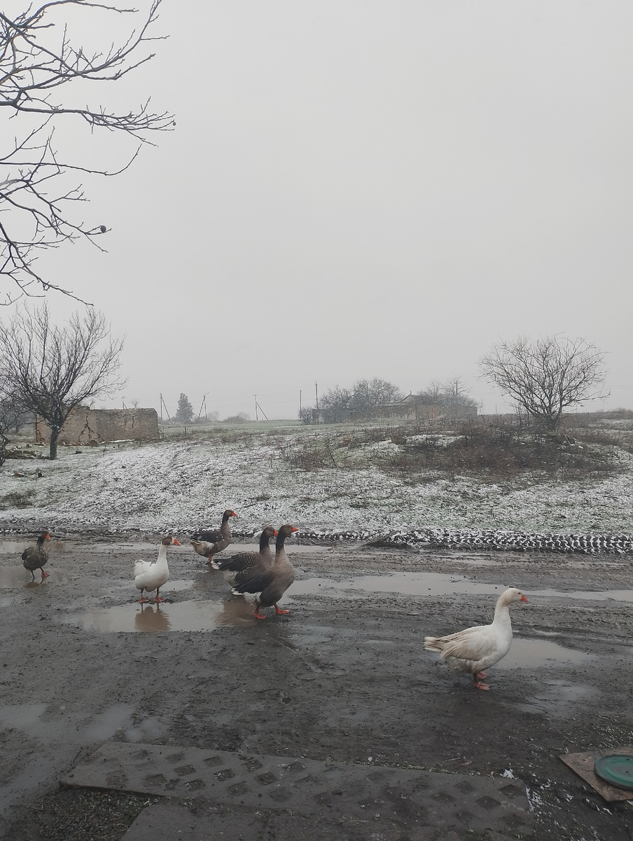 Я управилась, дождь всё лил, но уже ближе к обеду он стал мокрым, пушистым снегом, я вышла гусей загнать, думаю ну не делайте мне нервы, а идите домой.