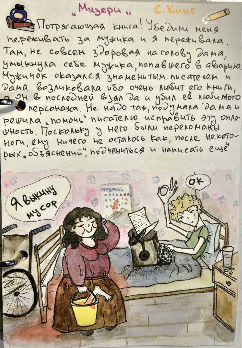 Потрясающая книга! Убедили меня переживать за мужика и я переживала. Там, не совсем здоровая на голову дама, умыкнула себе мужичка, попавшего в аварию. Мужичок оказался знаменитым писателем и дама возликовала ибо очень любит его книги, а он в последней взял да и убил её любимого персонажа. Не надо так, подумала дама и решила «помочь» писателю исправить эту оплошность. Поскольку у него были переломаны ноги, ему ничего не оставалось как, после некоторых «объяснений», подчиниться и написать ещё одну книгу-продолжение, где любимый персонаж будет жив и счастлив. Поскольку писателю не очень нравилось находится взаперти, да и книгу он писать не шибко то хотел, а дама была упёртой и уж очень хотела прочитать новую книгу, то ей пришлось наглядно доказывать, что книге быть. Она просто отрезала мужику ногу и большой палец левой руки, и он сразу всё понял и дописал свой роман. Концовка была эпична, она была хороша в своём коварстве! Мужик напустил интриги, уговорил не читать пока он полностью всё
