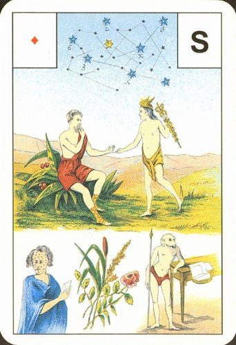 Ну что ж, продолжаем рассматривать карты колоды. На этот раз - 1 буби. ---------------------------------------- 1 буби - письмо, сообщение, важные новости, документы. Планета "Меркурий" - расчет, коммуникация, поездка, разговор, любознательность, память, интеллект. "S" - новые начинания, деньги, эмоциональное потрясение, неудачи, неконтролируемые импульсы, ловкость, одаренность, деловитость. "Гарпократ передаёт Гермесу тайное послание" - Гарпократ - египетский бог молчания, детства. Гермес - покровитель путешественников, охраняет пути, торгаш, коммерция, легко пересекает границы, вор, хитёр. Гермес очень схож с Лаверной, однако первый - всё-таки более положителен. Он является положительной стороной Меркурий, а Лаверна - отрицательной. Гермесу всегда всё сходило с рук благодаря его большой адаптивности и умению выкрутить ситуацию так, что он "не у дел", но со смешком каким-то. Ему не хочется мстить, он предложит что-то взамен на свой проступок. "Стоокий великан Аргус с письмом" - когда