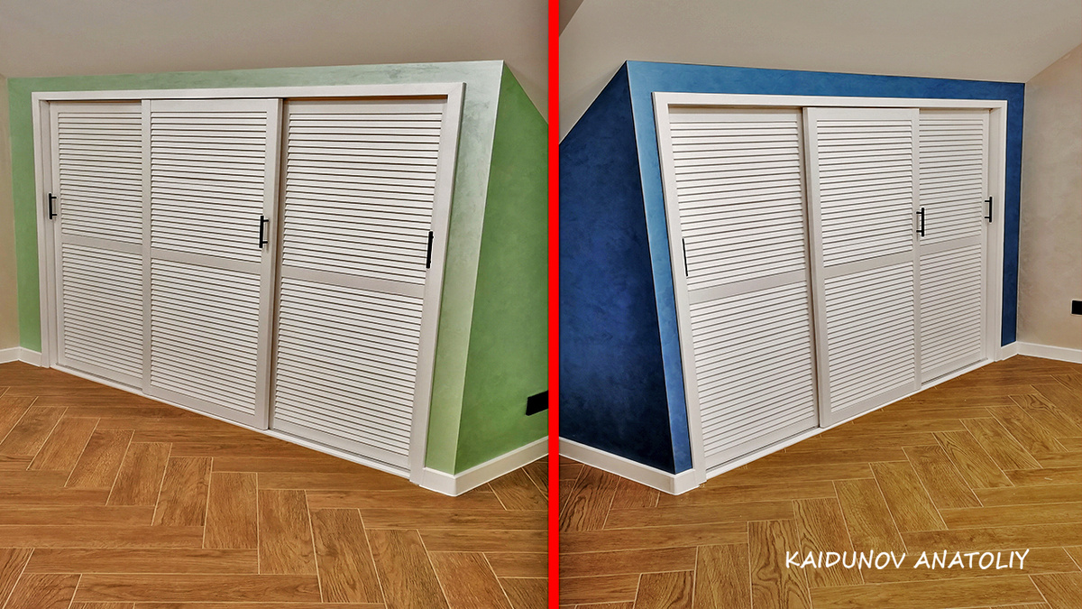 Ребята, всем привет, как всегда моя история начинается с того, что денег не было (ну как обычно) под завершение ремонта. За два шкафчика 1.8×1.5м озвучили мне 100тыс. Решил я сделать их сам из того что осталось после ремонта. Собрал каркас из металлических профилей для гкл, в местах будущих полок закрепил закладные из фанеры, и зашил это все гипсокартоном. Силуэт будущего шкафа уже обрисовался. Далее возник вопрос как сделать бюджетно двери. Направился в Леруа Мурлен, и о чудо! Попались мне подходящего размера жалюзийные двери (стоят они не дорого) решил их покрасить, и не прогадал, белые смотрятся гораздо лучше! Купил релинги и поставил двери на колёсики, теперь они стали дрери-купе) Далее всё это дело долго и мучительно зашпатлевал, особенно внутри шкафа было неудобно, зашлифовал шпатлёвку и естественно загрунтовать перед следующим этамом финишной отделки. На финиш решил использую декоративное покрытие (мокрый шёлк) достаточно легко наносится и смотрится очень красиво, цвета пер