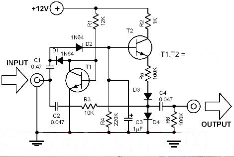 Во многих звуковых устройствах, регулировка и поддерживание выходного аудио сигнала на постоянном уровне является очень важным. Такое звуковое, или чаще всего голосовое регулирование часто применяется в домофонных устройствах, светомузыках, приборах автоматики или телефонных системах. Такой компрессор-регулятор уровня не должен быть очень сложным дорогими, ведь по сути требуется лишь пару транзисторов, чтоб реализовать данный эффект. Компрессор - своеобразный сжиматель сигнала по амплитуде. Схема, размещенная здесь, сочетает в себе простой дизайн и недорогие детали. Этот простой аудио компрессор использует прямолинейный метод стабилизации для постоянного контроля амплитуды выходного сигнала. В отличие от других распространенных методов, где выход используется для регулирования входного сигнала через цепь АРУ, выходной сигнал этой цепи регулируется входным сигналом. Этот метод упрощает общий вид. А транзистор Т2 работает в качестве единственного активного компонента в схеме