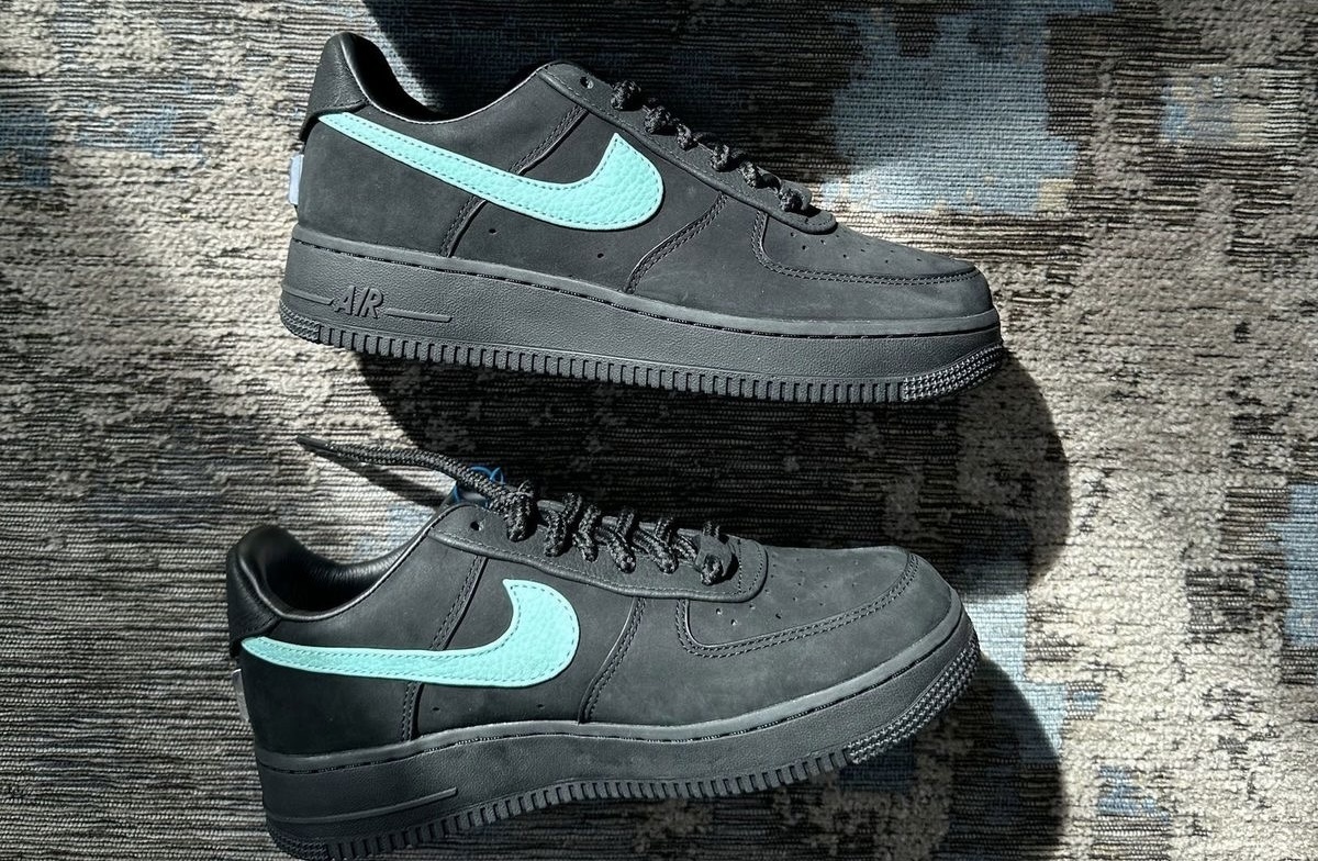 Кроссовки выполнены из премиальной чёрной замши, украшенной фирменным логотипом Nike Swoosh в культовом бирюзовом оттенке Tiffany Blue®. На задней части каждой пары размещена серебряная пластина с гравировкой, подчеркивающая ювелирное наследие бренда.