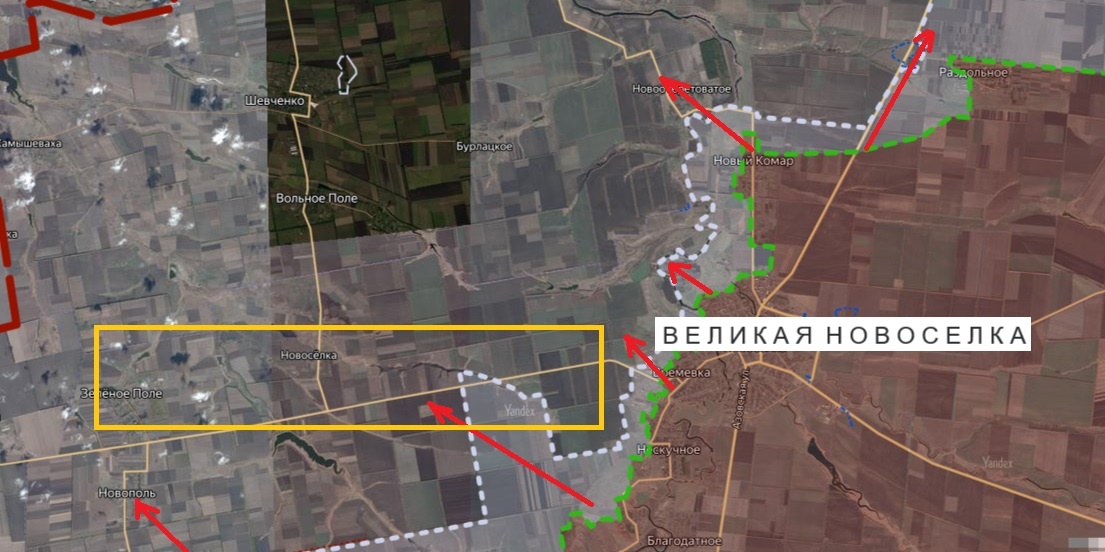 После небольшой паузы, связанной с объективными причинами, когда наш каток притормозил, сейчас началось его новое движение, каток поехал! Первый район, где он начал движение: Сейчас здесь наша активность выглядит примерно таким образом. Активизация идёт сразу в нескольких направлениях, в основном на север и на запад. И хотя продвижение пока только началось, но успехи уже появляются. Сделаем пояснение, что в жёлтом прямоугольнике территория, которая по ряду данных уже наша, сделано это было широким переходом через дорогу с последующим закреплением. Пока официально не объявляли, но многие уже ждут, что каток буквально помчится по этой дороге на запад. Мы пока не столь оптимистичны, но тоже ждём от него движения именно по этой дороге, на которой не так уж много населёнников: Кстати, помните, что мы писали про степи и поля, дескать там продвижение будет совсем другое, не такое, как в плотной застройке? Так вот есть первые кадры (продвижение на запад), как там может получаться: Вон на четве