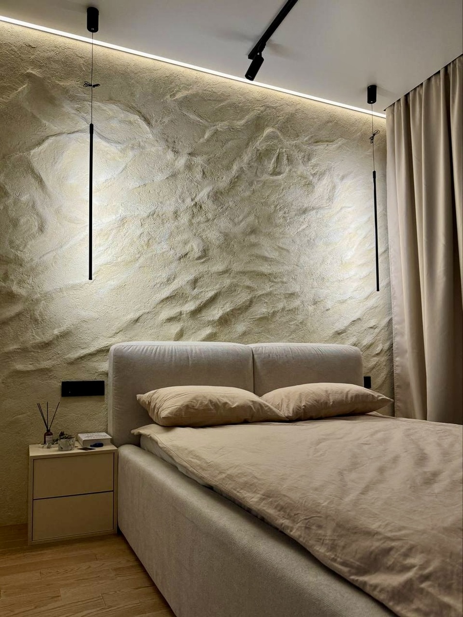 ИМИТАЦИЯ СКАЛЫ из архитектурного бетона уникальный и природный элемент в интерьере спальни. Такой дизайн создает атмосферу уюта и спокойствия, позволяя расслабиться и насладится отдыхом. Светильники подчеркивают текстуру скалы, создавая интересные световые эффекты. Игра света и тени добавляет глубину и объем, что делает пространство более динамичным и живым. Для достижения гармонии в интерьере можно использовать натуральные материалы и цвета в текстиле и мебели, чтобы дополнить бетонные элементы. Например, деревянные детали, мягкие ткани и зелёные растения помогут создать уютную атмосферу и сбалансировать холодность бетона. 📌Выбрать цвет и посмотреть образцы изделий можно у нас в Шоу-Руме по адресу: г. Москва, ул. Бутырская д. 5 тел. 8 499 346 66 29+ WhatsApp