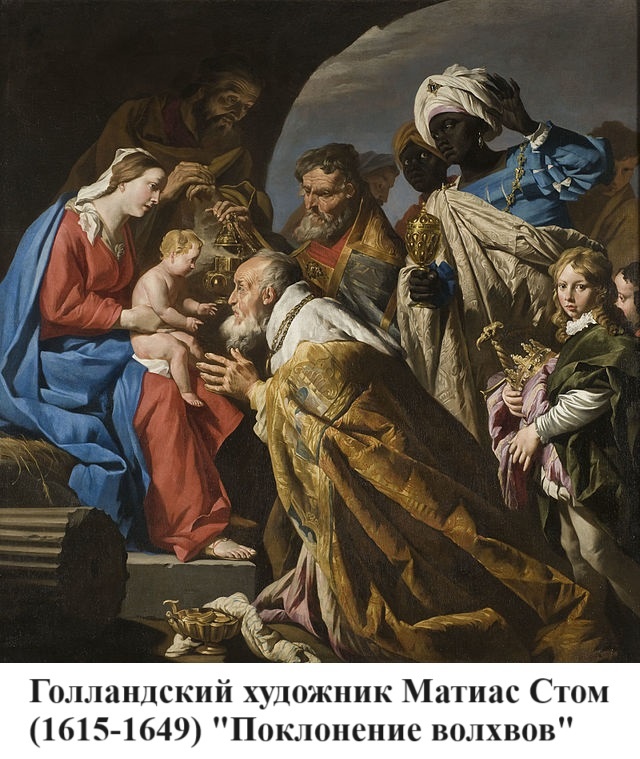 Из Евангелие известно, что в момент рождения Христа в городе Вифлеем его родителей Иосифа и Марию посетили волхвы, которые принесли им дары, и заявили, что это не простой ребёнок. Есть картины на эту тему "Поклонение волхвов" нескольких авторов, например Джотто ди Бондоне (фреска в часовне Арена в Падуе. См. "Наука и жизнь", №11,1989, с.101), Питера Брейгеля ("Наука и жизнь",№2, 1991г., 8-я стр. вкладки). Здесь приведена картина голландского художника Матиаса Стома.