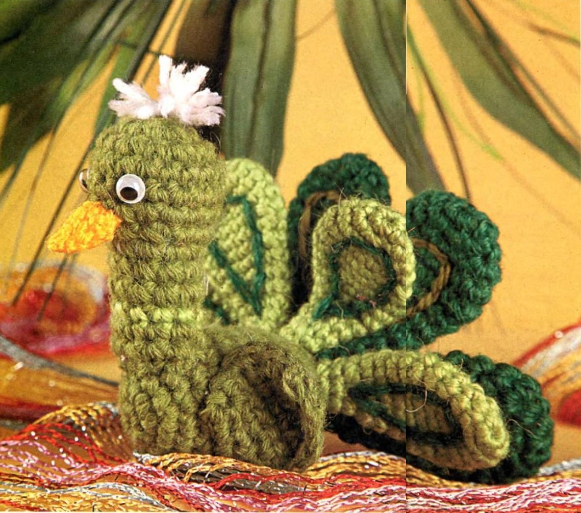 Важный павлин Вам потребуется: остатки пряжи средней толщины различных цветов, крючок №4. Голова и шея: наберите 2 возд. п. 1-й ряд - ввяжите во вторую петлю от крючка 6 ст. б/н. 2-3-й ряды - вяжите по кругу ст. б/н, удваивая каждый ст. 4-й ряд - вяжите ровно. 5-6-й ряды - равномерно убавьте по 2 ст. 8-14-й ряды - вяжите ровно. Не стягивайте петли, набейте деталь синтепоном. Туловище: наберите 2 возд. п. 1-й ряд - ввяжите во вторую петлю от крючка 6 ст. б/н. 2-4-й ряды - вяжите по кругу ст. б/н, равномерно прибавляя 6 ст. 5-10-й ряды - вяжите по кругу ровно. 11-й ряд - вяжите *2 ст. б/н, 2 ст. б/н вместе*, повторяйте *-* по кругу. 12-13-й ряды - вяжите по 2 ст. б/н вместе по кругу. Стяните оставшиеся петли, набивая синтепоном. Хвост: наберите 2 возд. п. 1-й ряд - ввяжите во вторую петлю от крючка 6 ст. б/н. 2-3-й ряды - вяжите по кругу ст. б/н, равномерно прибавляя 6 ст. 4-5-й ряды - вяжите ровно. 6-12-й ряды - равномерно убавьте в каждом ряду по 2 ст. 13-14-й ряды - в