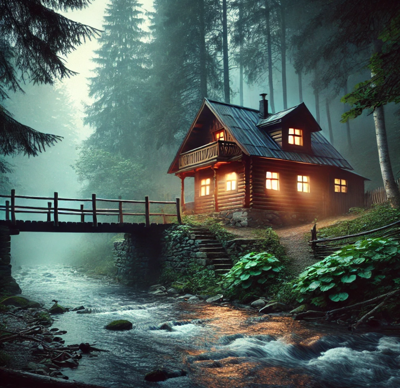 Не раздумывая, путники пошли на звук. Через полкилометра они вышли к берегу быстрой речки, шириной метров в четыре. На берегу, в темноте, виднелся ветхий домик. На крыльце, со свечой в руке, стояла женщина, а у её ног лежала большая собака.