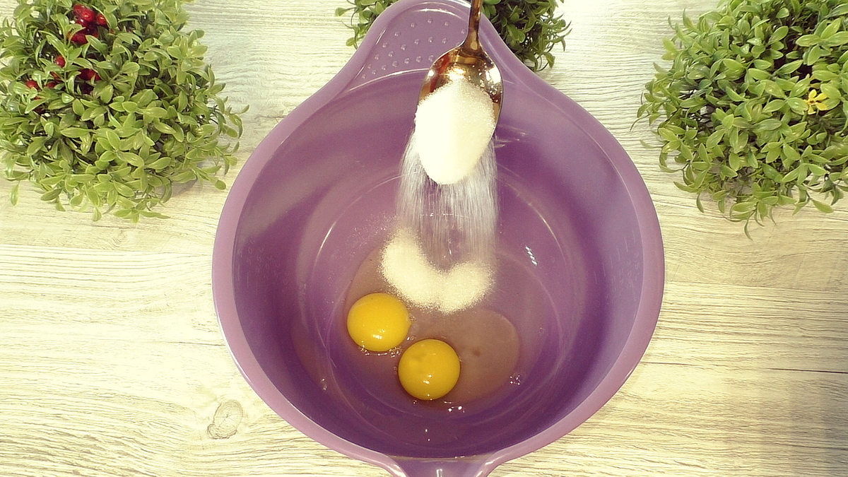В миску добавить яйца и 1 ст. л. сахара из общего количества, перемешать.