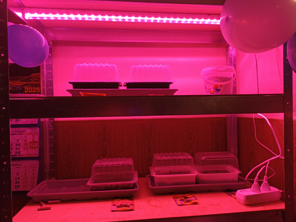 Чтобы использовать стеллаж, который я покупала изначально для рассады и под который покупались фитолампы, мне пришлось купить ещё один. Потому что зимой на нём хранились компоты. А к рассадному сезону мы их в этом году не успели выпить. Пришлось делать перестановку.