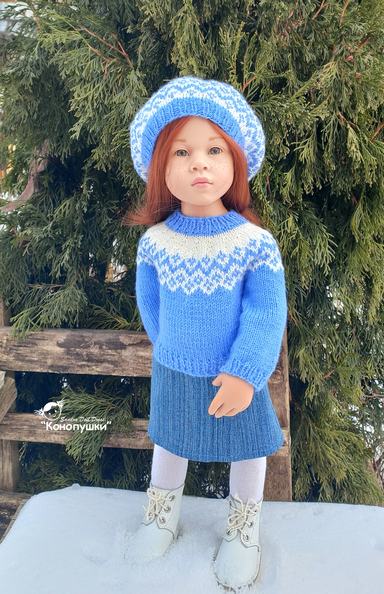 Приветствую подписчиков и гостей канала! Что такое, когда не везет, (а точнее не шьет машинка), но очень надо новую деталь для образа. Вот об этом и пишу. Скажу сразу, что при создании данной детали пострадали только мои нервные клетки и старая джинсовая юбка (которая уже давно мне мала), довисевшая в шкафу до своего звездного часа. Увлеклась я всерьез созданием гардероба для Готц. Берет я вам уже показывала Но одного берета мало, нужно его чем-то дополнить. Квадратную жаккардовую кокетку я уже вязала в комплекте "Зимняя соната" Поэтому я замахнулась на круглую. Не сразу получился у меня джемпер. Сначала я хотела начать узор сразу от горловины, но раппорт на берете не был рассчитан под увеличение на круглой кокетке, а мои дерзкие замыслы "придумаю что-нибудь по ходу дела" разбились в пух и прах. Получалась откровенная бяка. Поэтому дальше я пошла самым простым путем: увеличила постепенно количество петель под кратное раппорту и равное тому количеству, которое уже нужно будет при форми