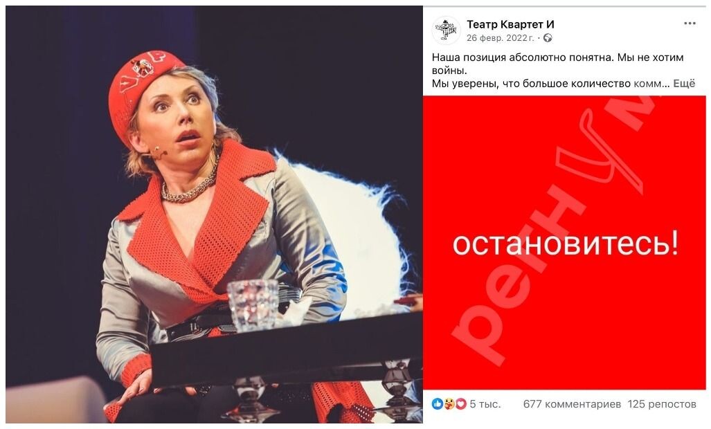 К слову, о «блистательной»... Воробей – типичный представитель самой многочисленной колонны! Юмористка Елена Воробей, урождённая Лебенбаум, приехавшая покорять Россию из Белоруссии, по примеру многих своих коллег, оказалась между двух огней и в феврале 2022 года опубликовала в своих социальных сетях пост, в котором просила остановить кровопролитие. Знаменитый квадрат «Остановитесь!».