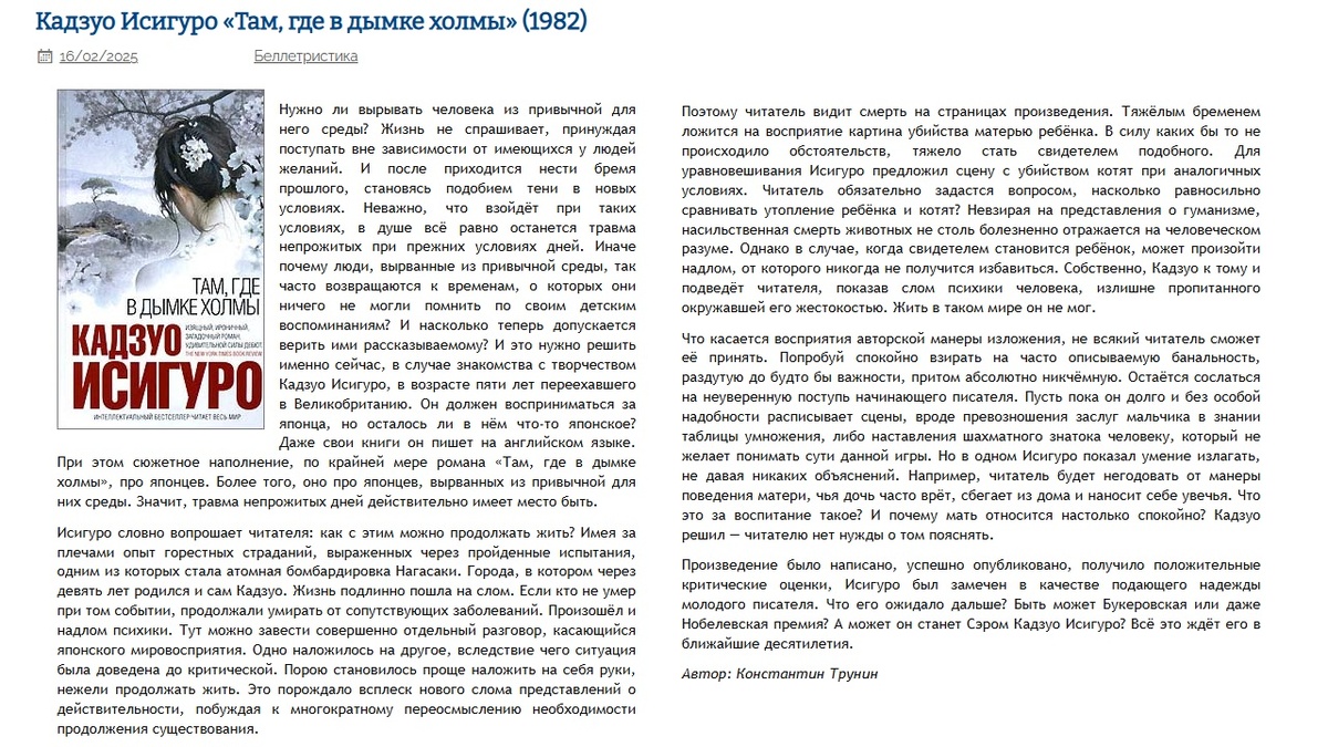 Кадзуо Исигуро "Там, где в дымке холмы" (1982) | Критика