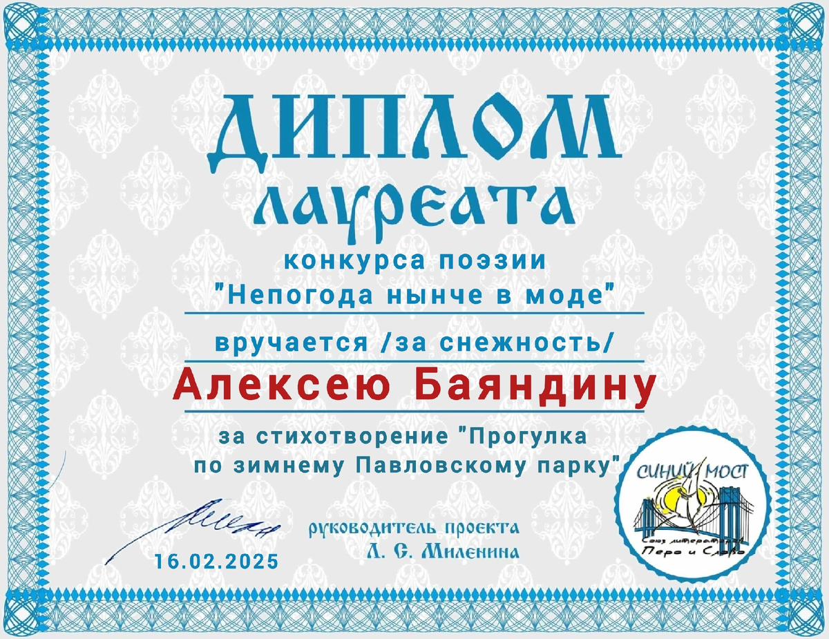 О задании конкурса Заданием очередного санкт-петербургского поэтического конкурса было использование при написании стихотворения аллитераций или ассонансов. По правилам лауреатов жюри выбирало исключительно по велению сердца. А значит, моё стихотворение тронуло сердце кого-то в жюри. Ну и не только в жюри, как выяснилось. И поэтому я вполне счастлив. Ведь задача искусства не заработать денег или нагрести призов. Смысл его, как мне кажется, в том чтобы затронуть струны души человеческой. И когда есть отклик, значит цель достигнута. Но есть в этом успехе и нечто материальное, ведь в качестве награды лауреаты кроме памятных дипломов и бонусных баллов в копилку получают возможность публикации в следующем сборнике авторов "Синего моста". А вот, собственно, и само стихотворение Прогулка по зимнему Павловскому парку Зимним днем почти что жарко… Лёгкий скрип скользящих лыж, В дымке Павловского парка Бирюза дворцовых крыш. Пруд, замёрзший лишь местами, И под крики вдалеке Покатились с г