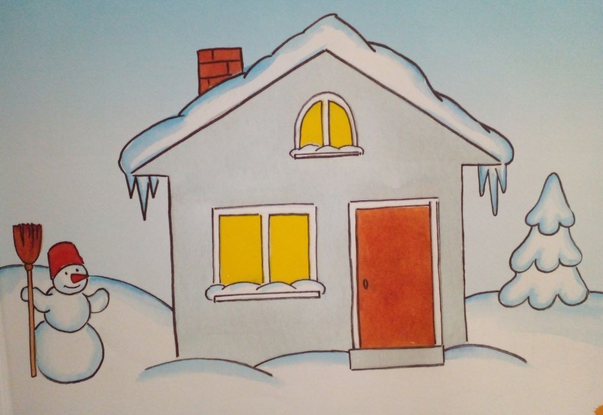 1. Рисуем прямоугольную основу и треугольную крышу. С двух сторон по бокам проведем линию горизонта. 2. Нарисуем квадратное окно, прямоугольную дверь и небольшое окно вверху. Справа нарисуем основу для елки, слева - снеговика, обозначим сугробы. 3. Сотрем лишние линии. 4. Добавим детали. 5. Раскрасим рисунок красками или карандашами.