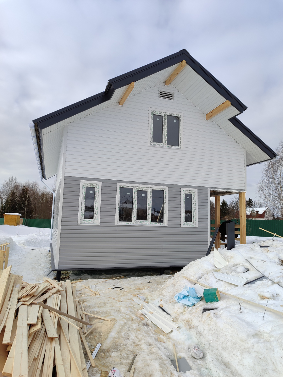 По ценовой политике мы выбрали двухэтажную баню по каркасной технологии, с зимним утеплением, на свайном фундаменте. И так, как каркасные дома можно строить зимой из сухой доски, мы к марту были уже с домом 👍🏻