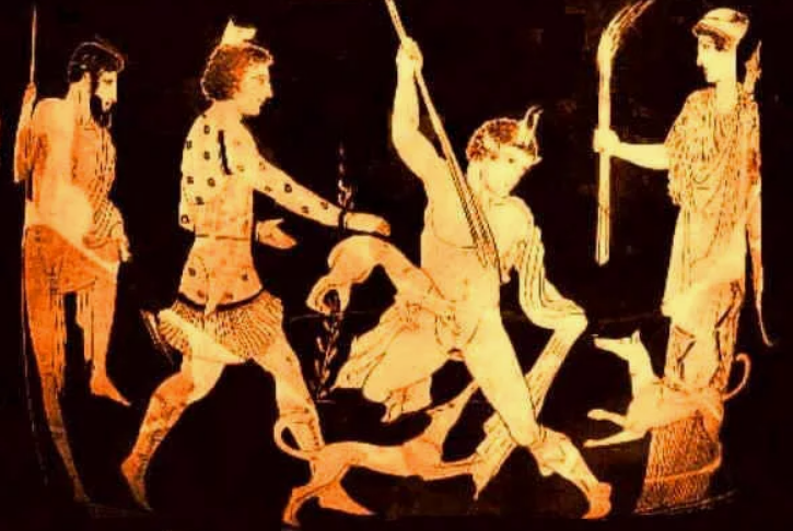 Актеон – внук Аполлона, страстный охотник, охоте его учил сам кентавр Хирон, на охоте его всегда сопровождали 50 собак. Однажды, охотясь в лесу, он увидел купающуюся богиню Артемиду и, я так полагаю, принялся подглядывать за ней, поражённый её красотой, за что богиня наказала его, превратив в оленя. Олень побежал, собаки, почуяв его, но, не узнав, бросились за ним. Догнав, они растерзали его.