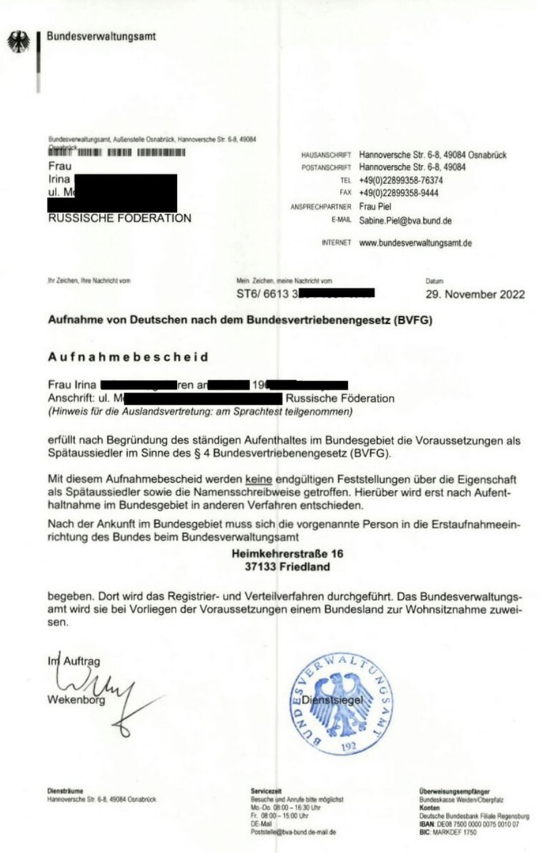 Начну с небольшого повторения, изначально заявления и полный пакет документов о приеме переселенцев направляется для рассмотрения напрямую в Федеральное административное ведомство Германии. Федеральное административное ведомство проверяет в рамках процедуры приема переселенцев, выполнены ли предписанные законом условия, и, если это так, выдает извещение о приеме, дающее право на въезд в Федеративную Республику Германия, оно называется Aufnahmebescheid.