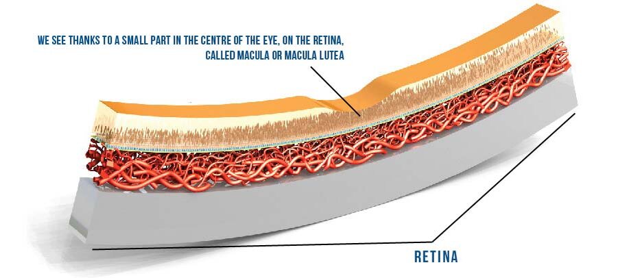 Макула – центральный отдел сетчатки, где плотно локализована основная часть фоторецепторов, что приводит к тому, что именно данный отдел отвечает за способность различать цвета и мелкие детали. Каковы особенности данной области, расположенной на заднем полюсе глаза? 1. В отличие от остальных отделов функциональной сетчатки, в углублении макулы содержатся только колбочки, а остальные элементы смещены к краю. 2. В центральных отделах сетчатки большое количество лютеина, окрашивающего макулу в желтый цвет, что дало ей ее второе название: «желтое пятно». Лютеин также выполняет защитную функцию, задерживая синию и фиолетовую часть светового спектра, которые наиболее агрессивны, а также связывает активные формы кислорода, обладающие повреждающим действием. Изомером лютеина является зеаксантин. 3. Центральная зона макулы – фовеа – лишена сосудов. Заболевания макулярной зоны крайне опасны и требуют обязательного лечения. Одним из наиболее частых вариантов поражения макулы является развитие м