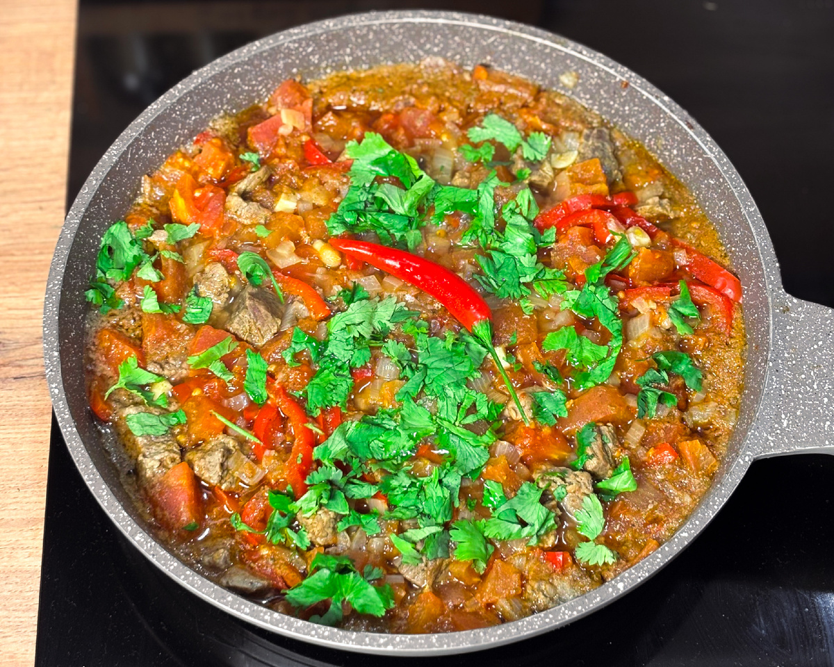 Чашушули точно одно из самых вкусных традиционных грузинских блюд! Даже если вы никогда не были в Грузии, этот рецепт поможет вам прочувствовать её колорит. Блюдо готовится несложно, но требует терпения, чтобы мясо стало нежным и полностью впитало аромат специй. Интересный факт, что Чашушули переводится с грузинского как «тушёный», и на родине его традиционно готовят из телятины, хотя можно использовать и говядину — всё зависит от ваших предпочтений и доступности продуктов. Если захотите сохранить аутентичность, подавайте Чашушули со свежим лавашем или лепёшкой! Ингредиенты: Приготовление: Подготовка ингредиентов Говядину нарежьте средними кусками (примерно 2,5×2,5 см). Лук порежьте полукольцами. Чеснок измельчите. Болгарский перец промойте, удалите сердцевину и косточки, нарежьте полосочками или кубиками. Помидоры ошпарьте кипятком, снимите кожицу и измельчите (по желанию нарежьте мелкими кубиками). Обжарка мяса В казане или глубокой сковороде разогрейте растительное масло.