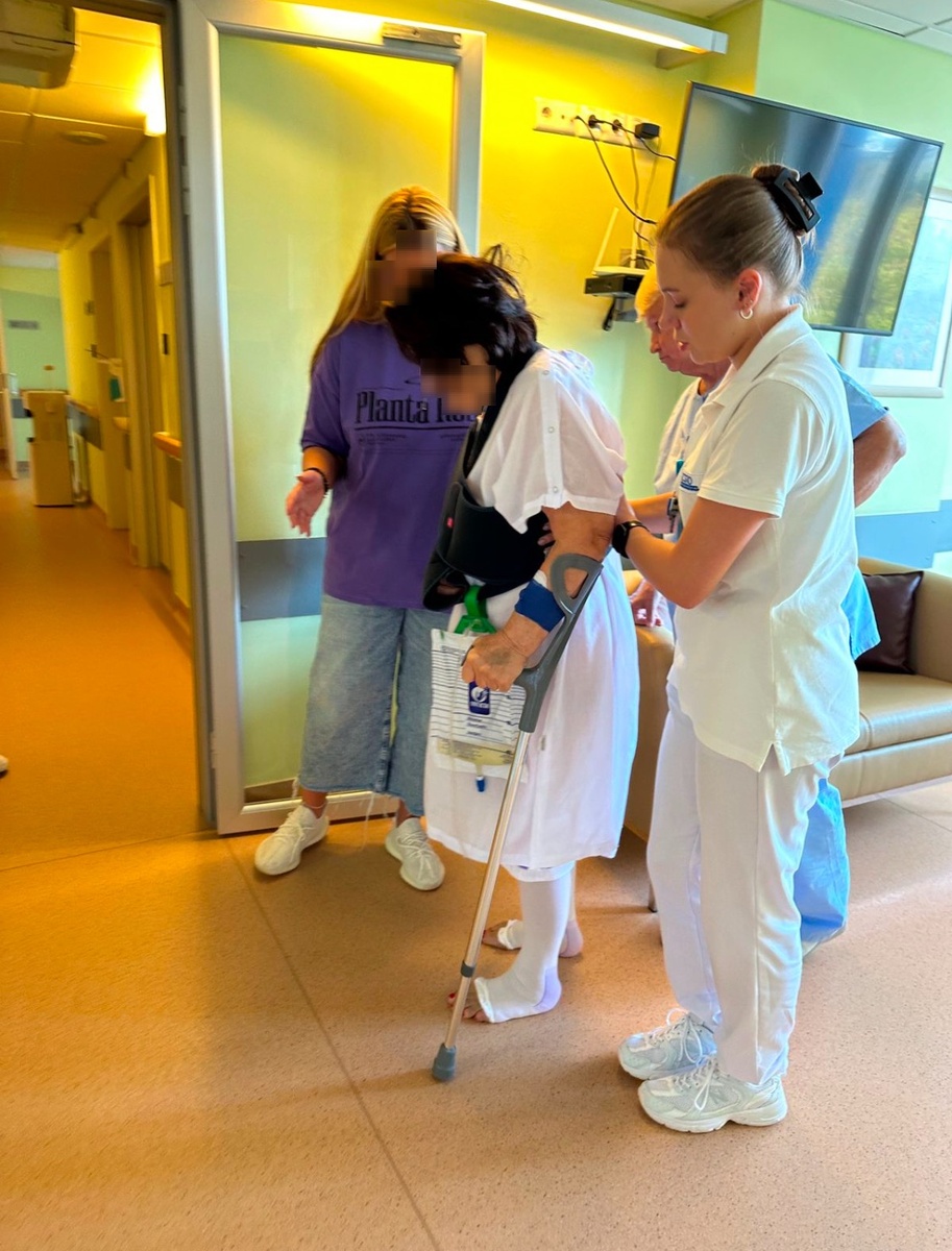 Правда, не бедра. Одна шейка плеча, другая - бедра. С одной стороны. Когда такое случается, первая мысль - а как же ходить после операции? Костыли же нужна, а тут рука сломана! Это реально было бы проблемой, если бы мы делали остеосинтез шейки бедра, то есть - скрепляли бы кости металлическими конструкциями. Тогда костыли на срок 6-8 месяцев были бы обязательны. Здесь же речь шла только об эндопротезировании тазобедренного сустава - пациентке 78 лет. К счастью, шейка в операции не нуждалась, такие переломы сами быстро срастаются, достаточно косыночной повязки. Итак, спокойно берём, и спокойно протезируем повреждённый тазобедренный сустав. Сразу после операции начинаем стандартный протокол реабилитации, встаём и ходим. С полной нагрузкой на оперированную ногу, сломанная рука на косыночной повязке, в здоровой руке костыль - для уверенности и равновесия. Пациентка - героическая 78-летняя женщина. Никаких жалоб, одно только стремление встать на ноги. Дело было в сентябре. Вчера моя асс