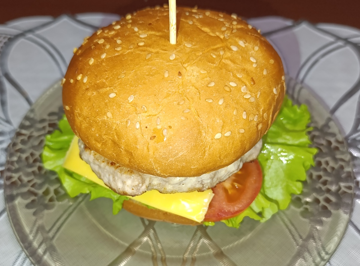 Ингредиенты: булочка с кунжутом - количество по количеству бургеров фарш - по количеству бургеров (в среднем грамм 100 на 1 бургер) листья салата - по 1 на 1 бургер помидор - по 3 колечка на каждый бургер (по желанию) лук - по 3 колечка (по желанию) маринованный огурец - по 3 колечка (по желанию) зернистая горчица 3 ст л (хватает на 5-6 бургеров) кетчуп - 2 ст л (хватает на 5-6 бургеров) черный перец - одна треть ч л (из расчета на 5-6 бургеров) паприка 0,5 ч л (из расчета на 5-6 бургеров) сыр - 1 пластина на 1 бургер (можно плавленый, можно обычный) Булочки разрезаем на пополам и обжариваем разрезанной стороной на сухой сковороде. Смешиваем горчицу, кетчуп, перец и паприку. При желании можно добавить сухой чеснок. Смазываем обжаренные булочки соусом с 2 сторон. Далее собираем Ваш бургер по вкусу: лист салата, помидор, лук, огурец (у меня без него). Если любите побольше соуса, то можно его еще сверху добавить. Кладем ломтик сыра. Тем временем фарш солим и перемешиваем. Больше в фарш н